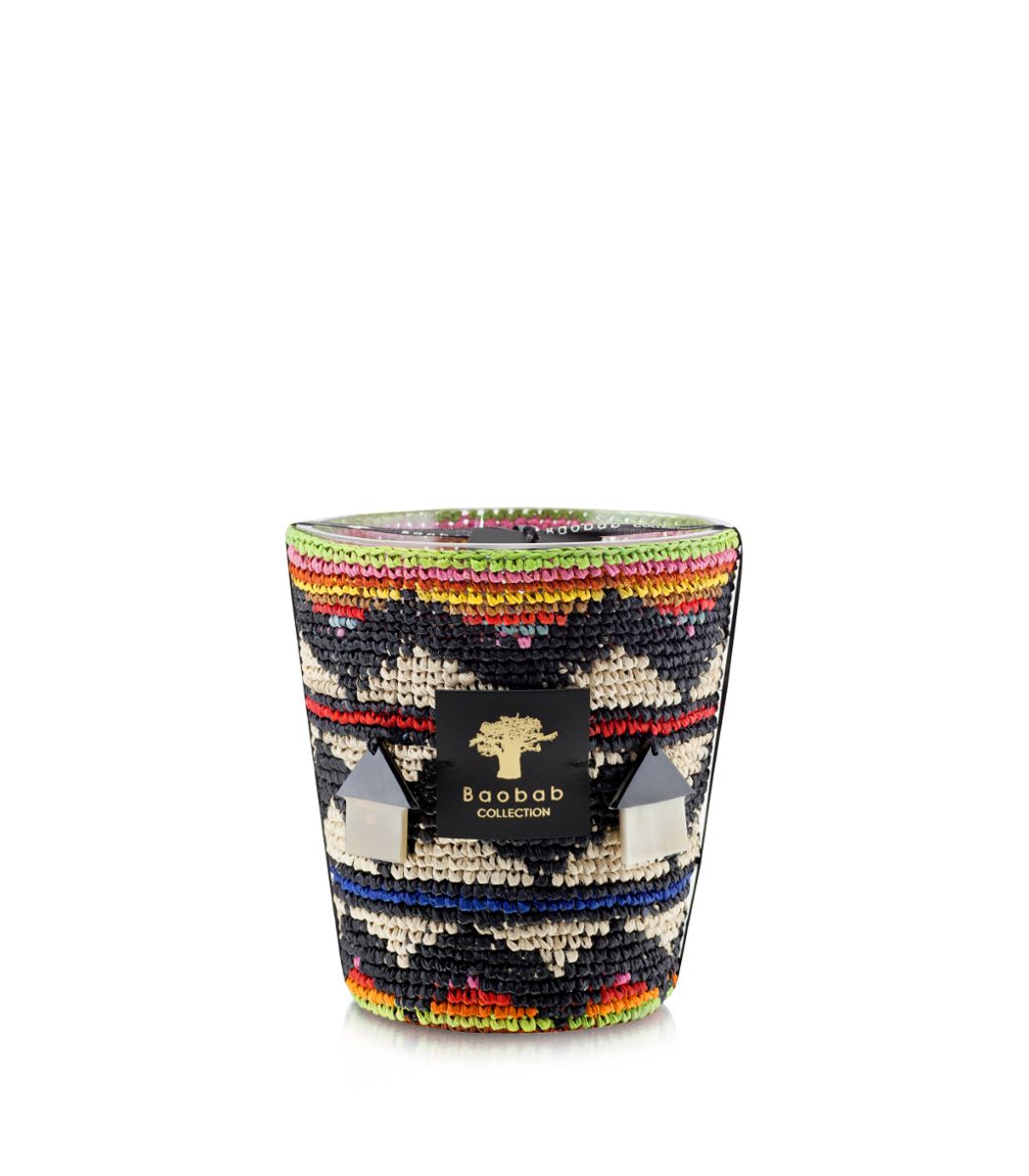 The Manala scented candle is named after Muzi’s son who became one of the spiritual lea- ders of the Ndebele tribe. This candle in a crocheted raffia basket with a black, beige and multicoloured-stripe pattern is typical of contemporary Ndebele art. It offers the perfect finishing touch to any style of interior design.