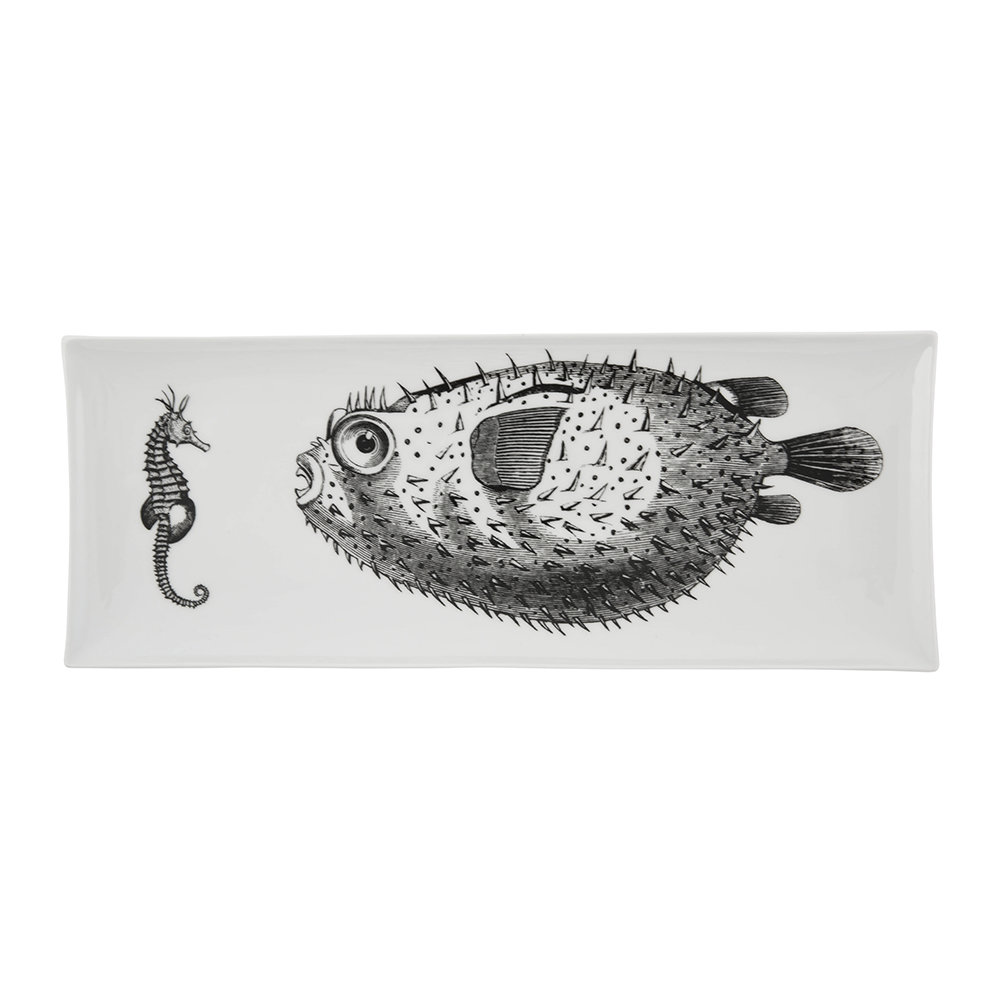 Fornasetti's white porcelain Affronto tray showcases a black blowfish and sea-horse lithograph. This piece is handcrafted at the house's famed Milan atelier.