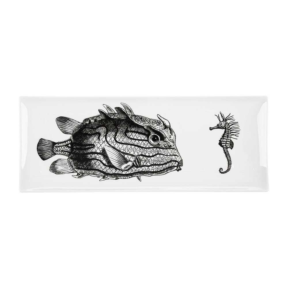 Fornasetti's white porcelain Incontro rectangular tray showcases a fish and sea-horse lithograph in black & white. This piece is handcrafted at the house's famed Milan atelier.