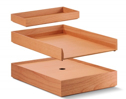 If a tidy house is a tidy mind, then SCRIPT is the ultimate helper. SCRIPT is pure neatness on three or more levels, writing instruments and documents are cleanly arranged and available at any time. The system is made of fine alder wood and designed to ensure that all elements are stackable. The upper pen tray can also be moved. The most important documents or love letters are stored in the bottom box where the view from curious eyes is protected by a lid. The correspondence in the basket above is always at hand, awaiting its review. And since there is always something to sign, pens & Co. can be found in the pen tray, representatively awaiting their deployment.