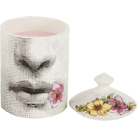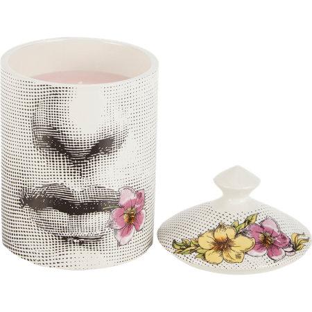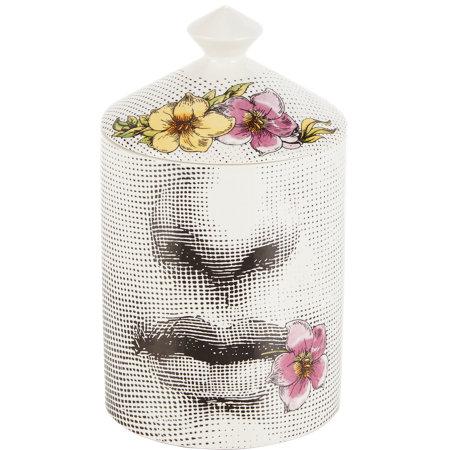 White and black ceramic 'Fior Di Bacio' scented candle from Fornasetti. Inspired partly by the lush flora that fills the gardens that envelop the Fornasetti house in Milan but also by the floral imagery created by Piero Fornasetti and taken from the vast archive. Created by perfumer Emmanuel Philip.