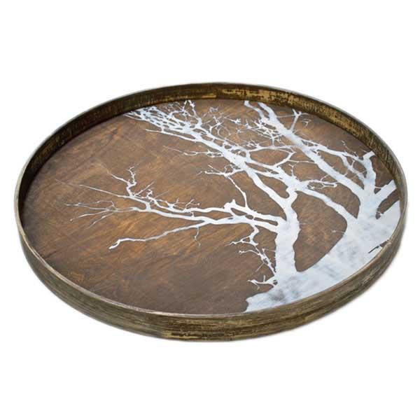 Inspired by the European travels of company founders Robert Gorst and Dawn Sweitzer, these trays have a short, raised, slightly distressed edge that confines contents without distracting attention from the traditional details applied to the mirrored surface. This tray makes an exquisite all-season serving dish or sideboard centerpiece.