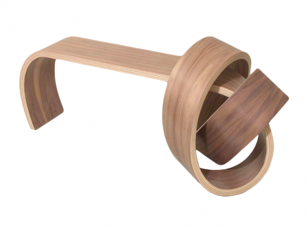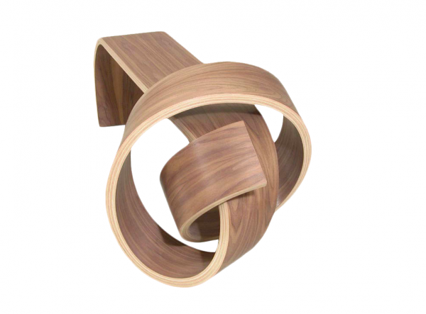 This extraordinary bench has been coaxed into a complex knotted form. Graceful and fluid, the "knot" belies the rigidity of the wood and the demanding techniques required to realize it. The artist is a master of vacuum press lamination and is able to transform flat plywood into dramatic and arresting curves, further defined and finished with walnut or rustic elm veneer.