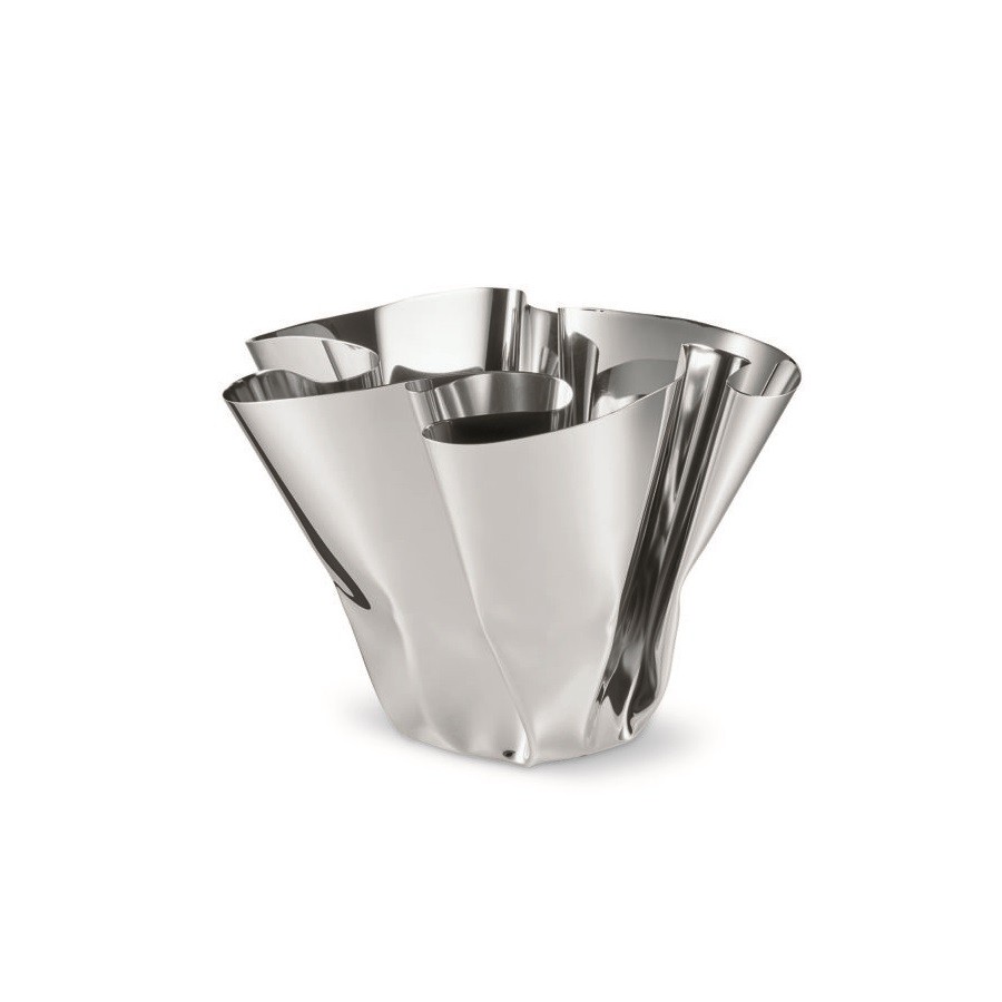Handcrafted and lain in folds like a theater curtain, the MARGEAUX vase sways in elegant waves. Despite its unobtrusive 12 inches diameter, even with a flower bouquet inserted, MARGEAUX loves to be center stage and enchants one with its appearance. The highly polished stainless steel gives it a particularly special note - with a drapery that is unequaled.