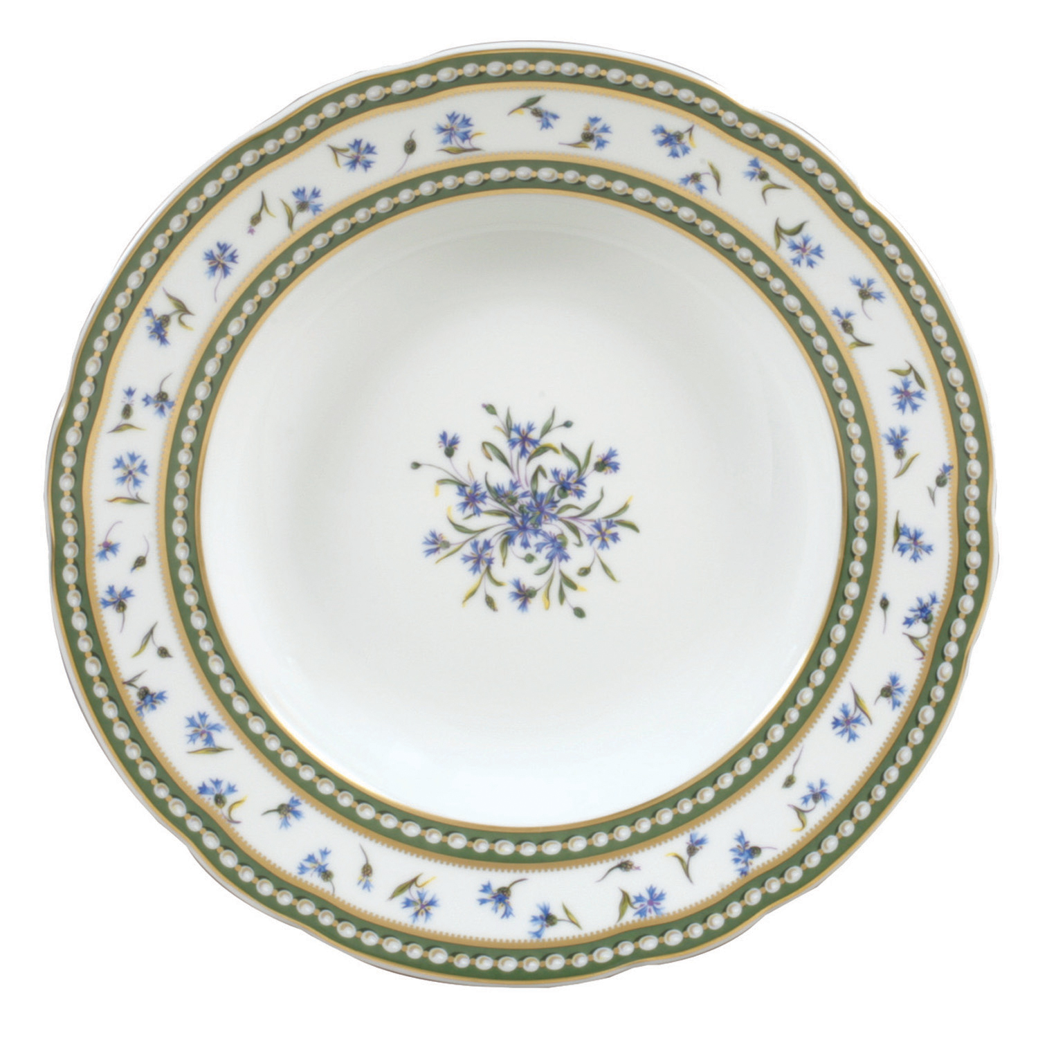 The cornflower, a simple wild flower, was a favourite of the queen. It was the colour of her eyes and she would gather them in fresh bouquets at the country retreat of her hamlet in the Petit Trianon. The restrained alignment of the strikingly realistic pearls reveals to us the sovereign’s innate penchant for luxury. The pattern of cornflowers is placed between two rows of pearls, set against a green background, and highlighted by golden filets. Looking as if they have been freshly gathered, a simple bouquet of wild cornflowers decorates the centre of the plate.