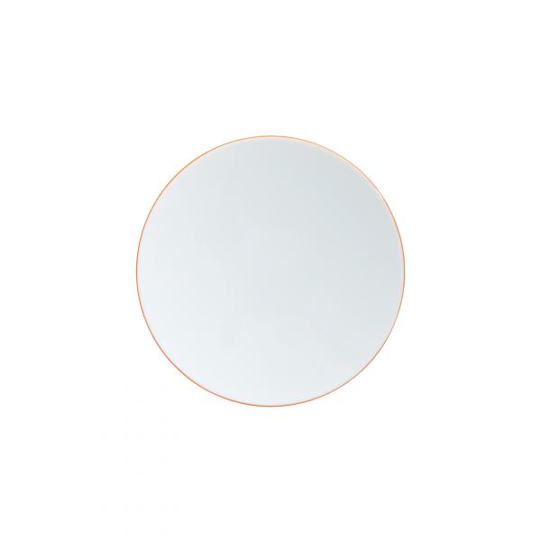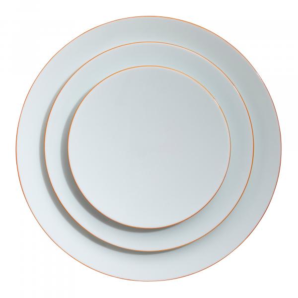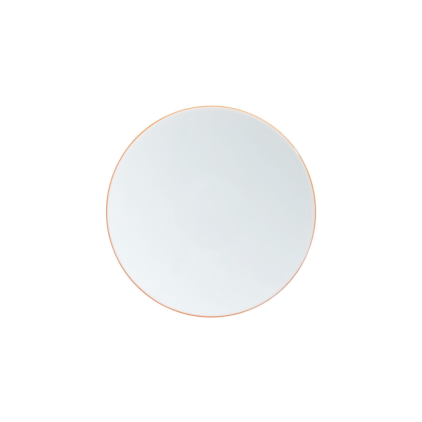 The edges of this elegant dinnerware are detailed with the slightest hint of orange for a dramatic effect. The elegant pieces can be used alone to bring understated wit to the table or dressed up by mixing in with patterns.