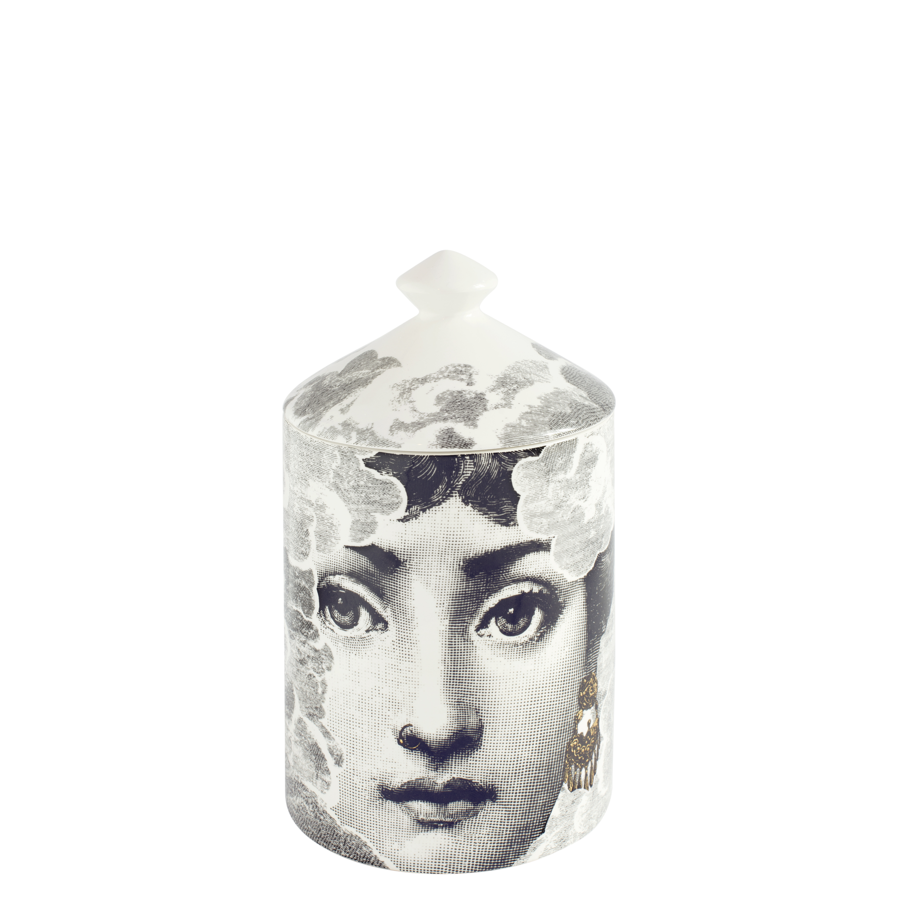 This new design features only one side of the votive to be adorned by Lina Cavalier’s iconic face. Embelisshed with fine golden jewels, Lina’s face is slighty covered and totally surrounded by the mesmerizing and hypnotic black and white clouds. This candle features the scent ‘Mistero’, which is inspired by Fornasetti’s creative spirit. A union of warm wood, spicy aromatic notes and a slight graphite note that is reminiscent of lead pencil and old dried ink to reflect the mystical element of the creative, sketching, drawing process.
