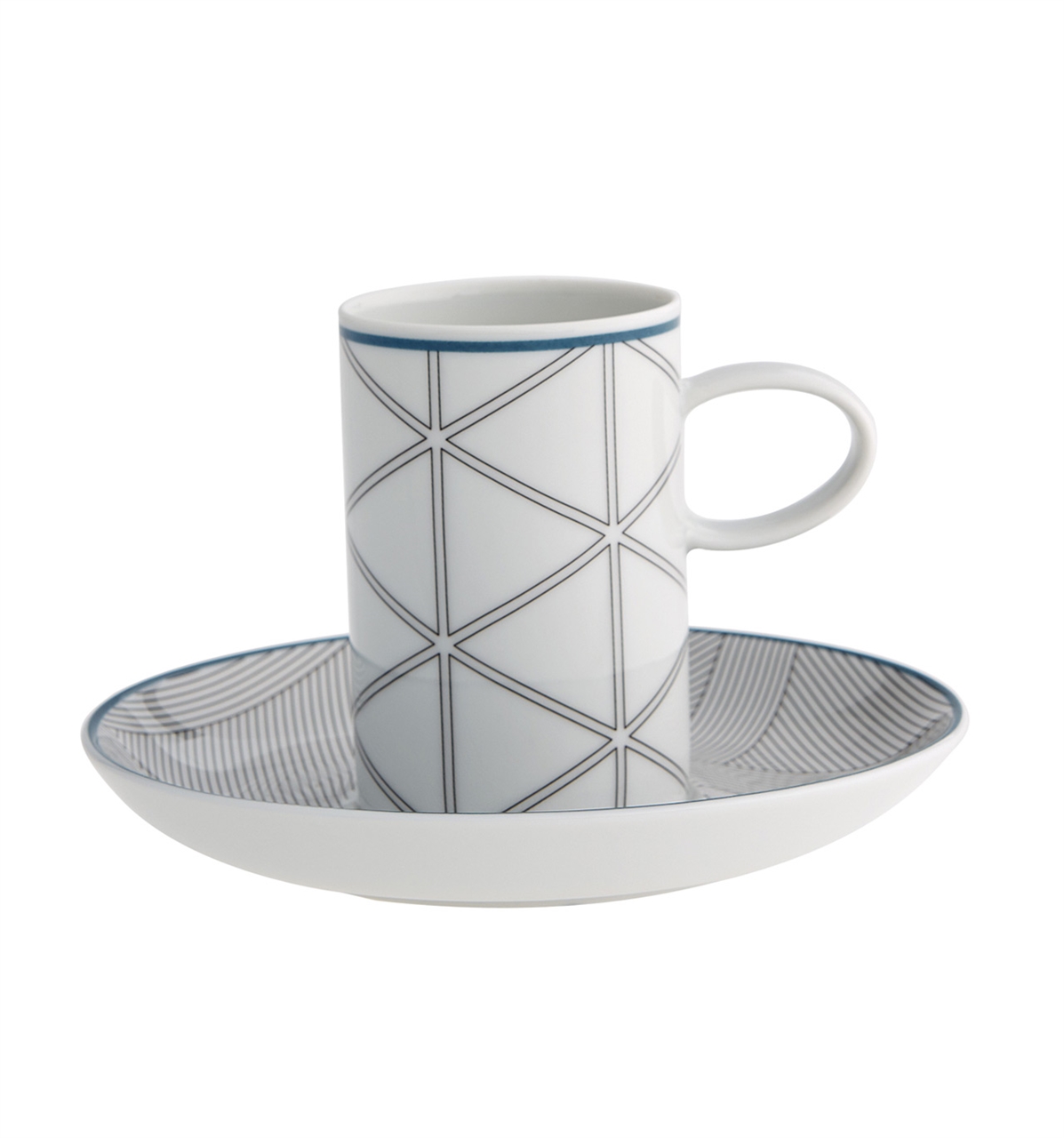 Coffee Cup and Saucer Blue Orquestra. Created by the designers David Raffoul and Nicolas Moussallem, Orquestra is tableware that combines different geometric line patterns, recreating the complexity of harmony and musical rhythms.