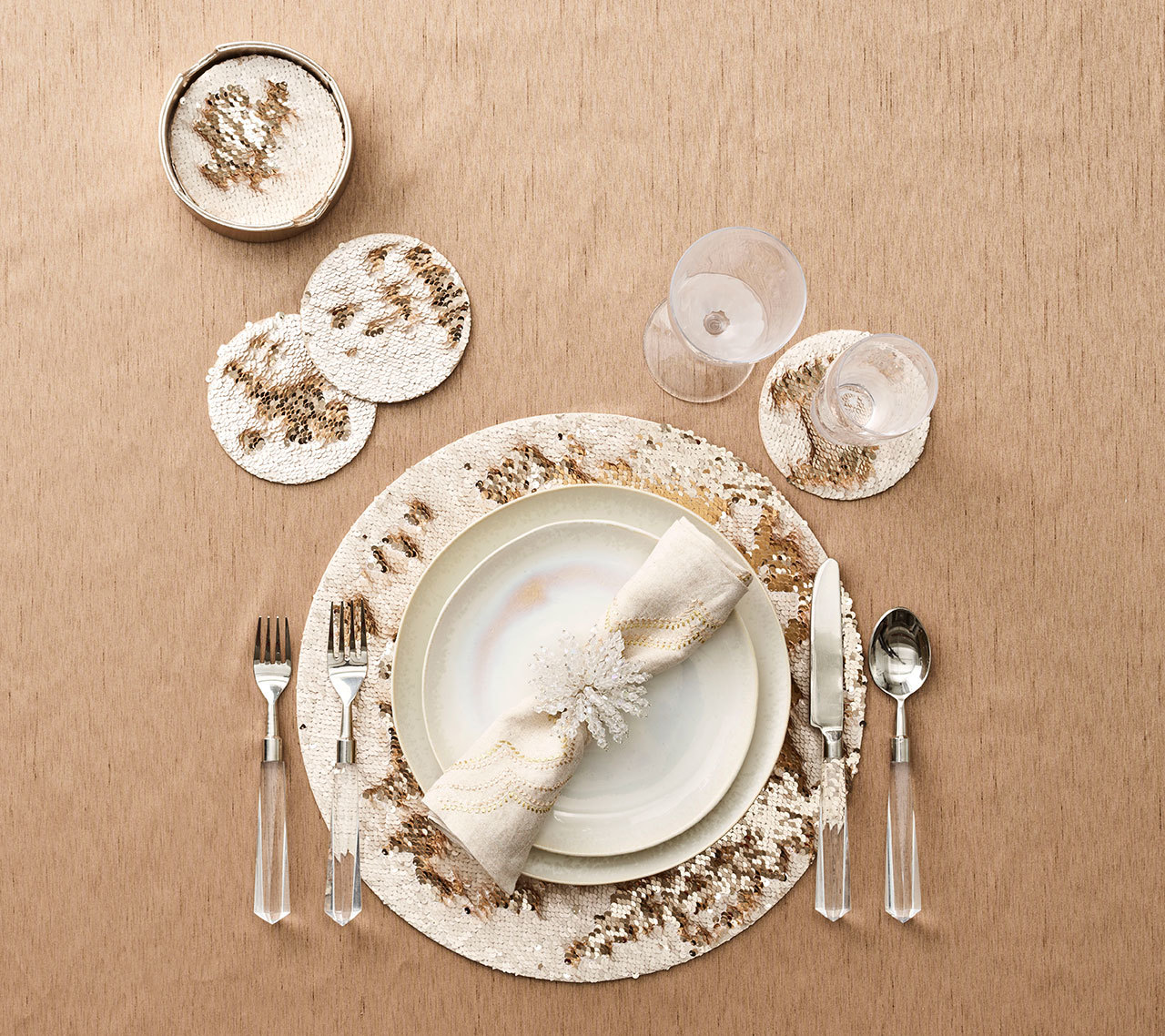 Liven up your dinner table and add some razzmatazz with the Reversible Sequin placemats. Champagne colored sequins turn to pale gold with a quick swipe of the hand. Oh what fun you'll have at your next party with these on the table, especially when paired with the Reversible Sequin coasters.
