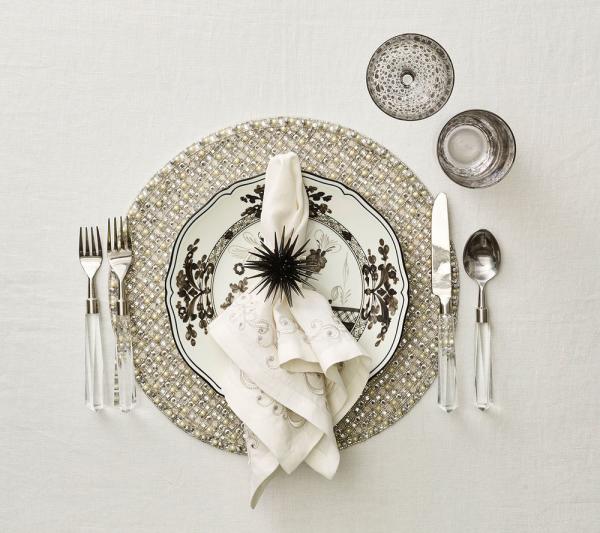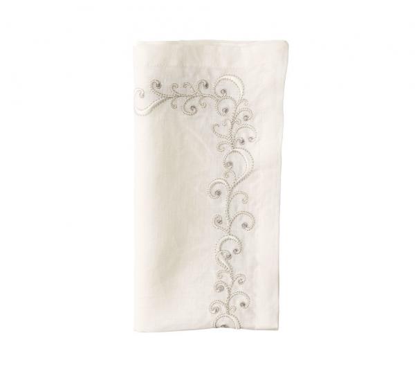 Undulating scrollwork in delicate gray and silver embroidery on the border of this white dinner napkin makes the Ritz an instant classic.