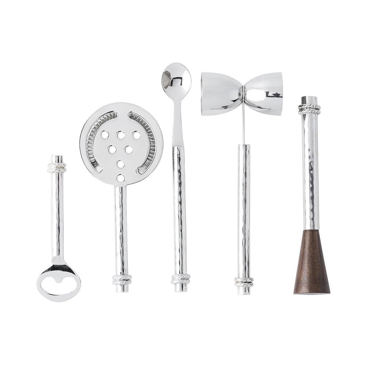 Hammered stainless steel bedecked with a tidy trimming of simple thread, this bar tool set is as handsome as it is supremely useful when crafting a cocktail, such as our favorite Monaco Mule! Set includes stand and five tools: double-sided jigger, cocktail strainer, bar spoon, bottle opener and muddler.