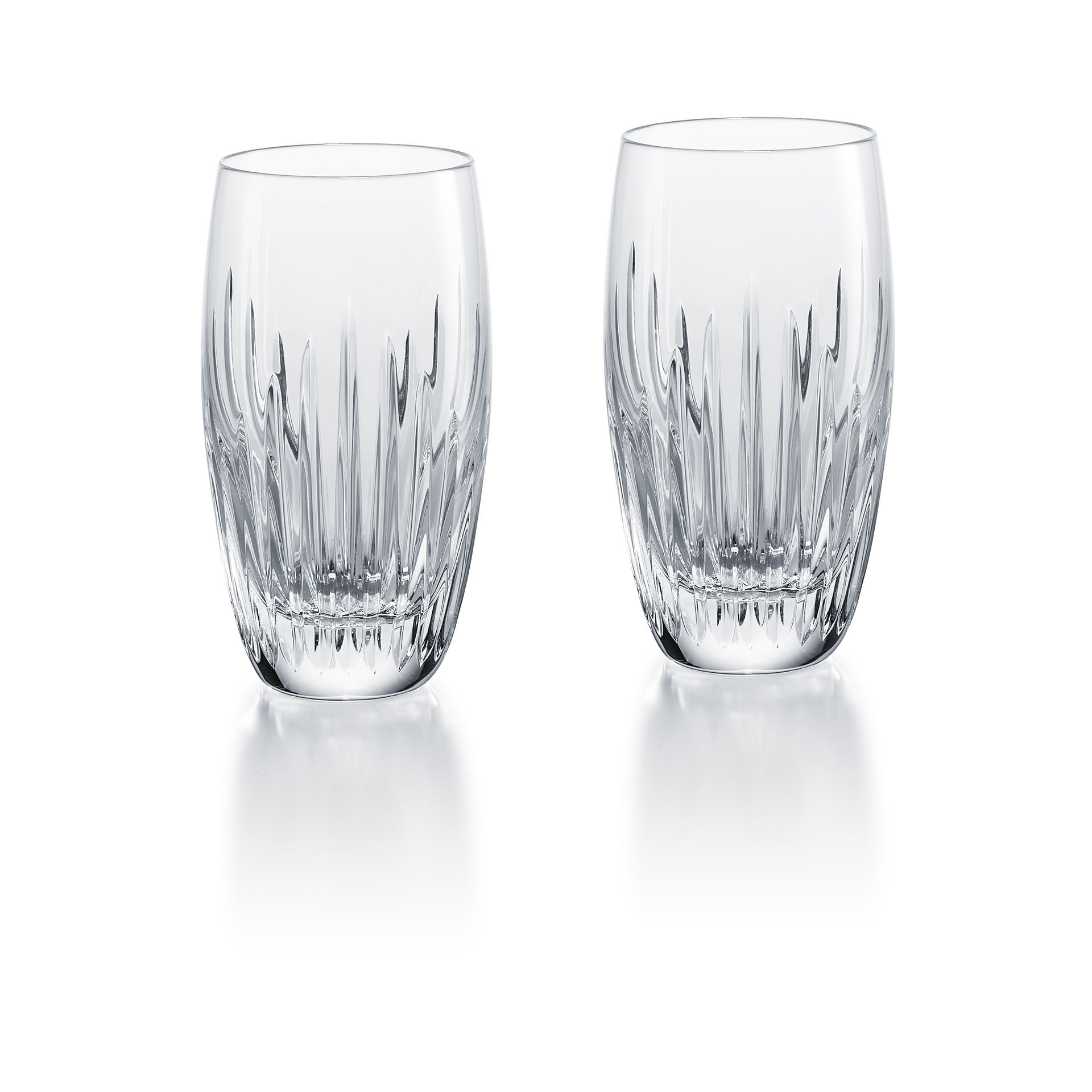 The Massena tumbler showcases Baccarat’s meticulous craftsmanship. Deep orgue bevel cuts, irradiating from the base, are etched directly into the Clear crystal. The intricate detailing gives the Massena tumbler a barrel-like appreance and a textural feel. This artful handiwork puts the upper smoothness of the glass in sharp relief. The polished silhouette and prismatic qualities make it worthy of any festive occasion or special soirée. The Massena tumbler is just one component of the Massena bar and tableware collection, which encompasses Massena wine glasses, highball glasses, and a decanter, all of which share a scrupulously textural quality.