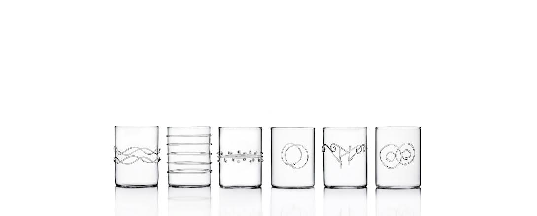 Set of six design transparent glasses, each enriched with a different transparent decoration; ideal for dinners with relatives and friends!