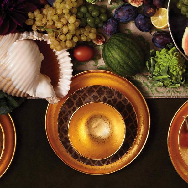 The artisans of Venice inspire us. We love not only their consummate abilities but also their way of being — a sumptuous tapestry of invention and delight, woven throughout everyday experiences. Their carefully guarded secrets and techniques have been handed down directly from the ancient world, one generation of skilled artisans to the next. The legendary fashion and textile designer Mariano Fortuny – revealing a deep and kindred connection that transcends time - sets the spirit of this collaboration. The L'Objet pour Fortuny dinnerware collection is composed of earthenware and metals with hand-gilded 24K gold accents.