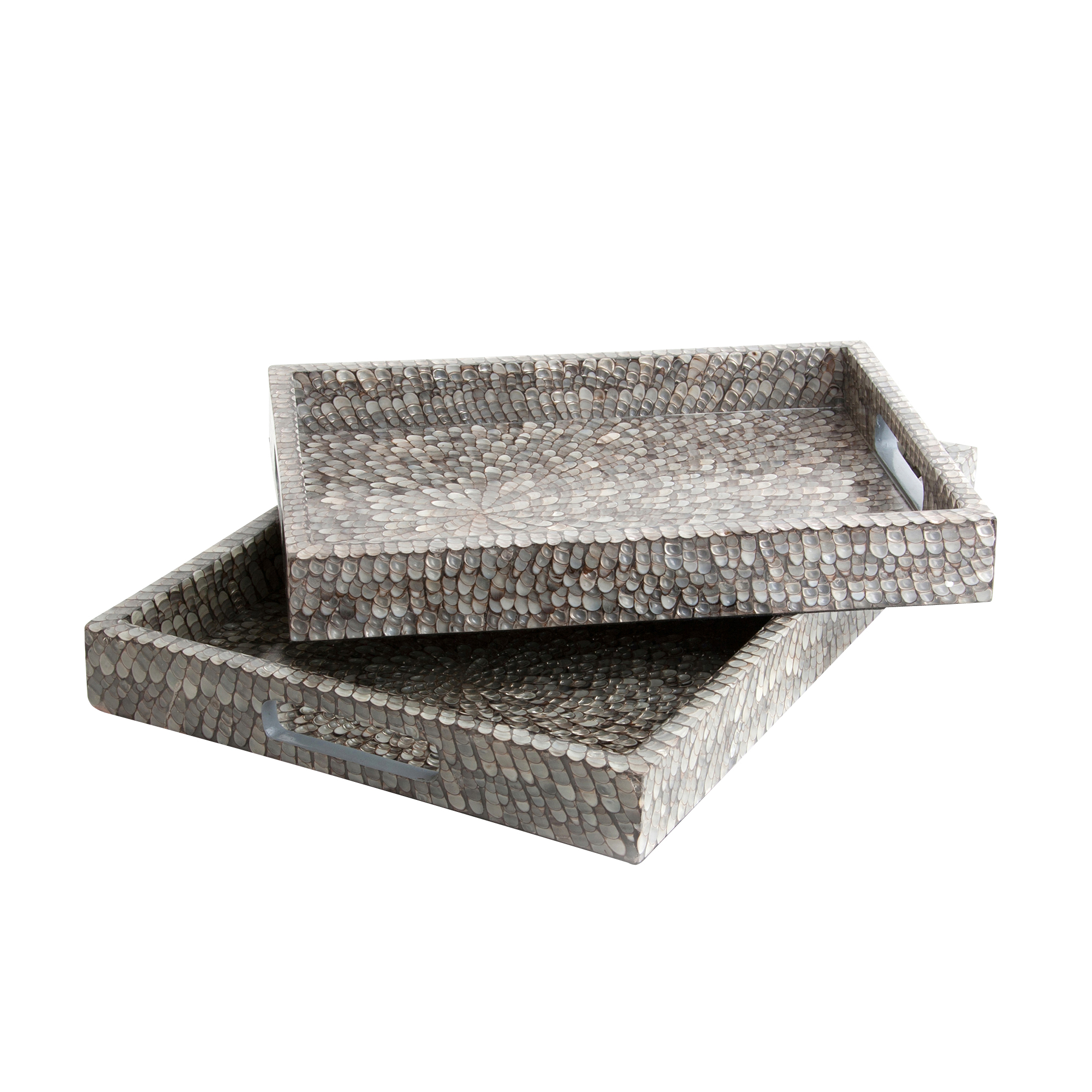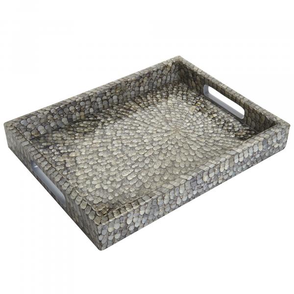 These clever trays feature beautiful vertagus shells set in resin. Whether you use it for serving or just as an elegant accent piece, this simple tray is a stunning addition to your decor.