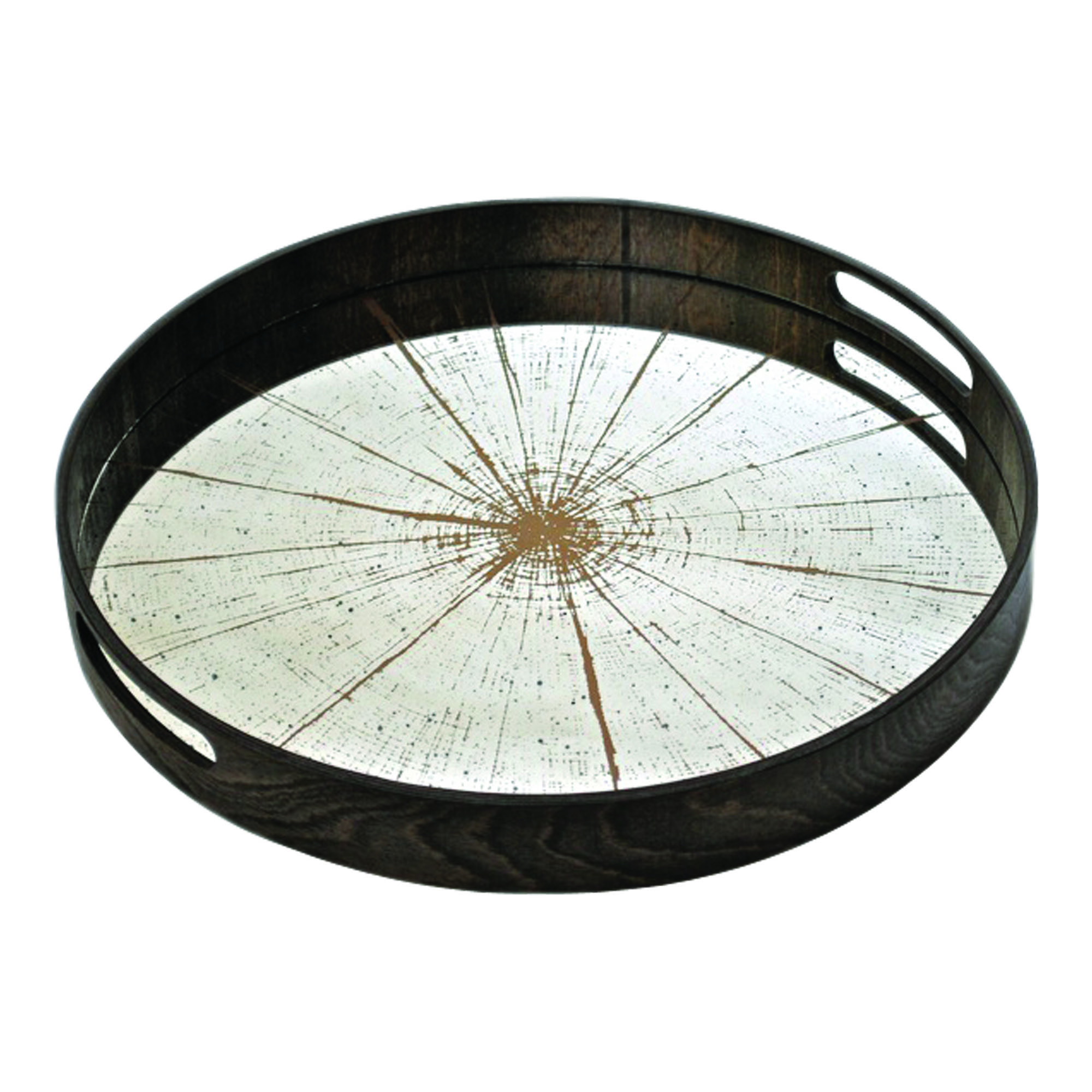 Inspired by the European travels of company founders Robert Gorst and Dawn Sweitzer, these trays have a short, raised, slightly distressed edge that confines contents without distracting attention from the traditional details applied to the mirrored surface. This tray makes an exquisite all-season serving dish or sideboard centerpiece.