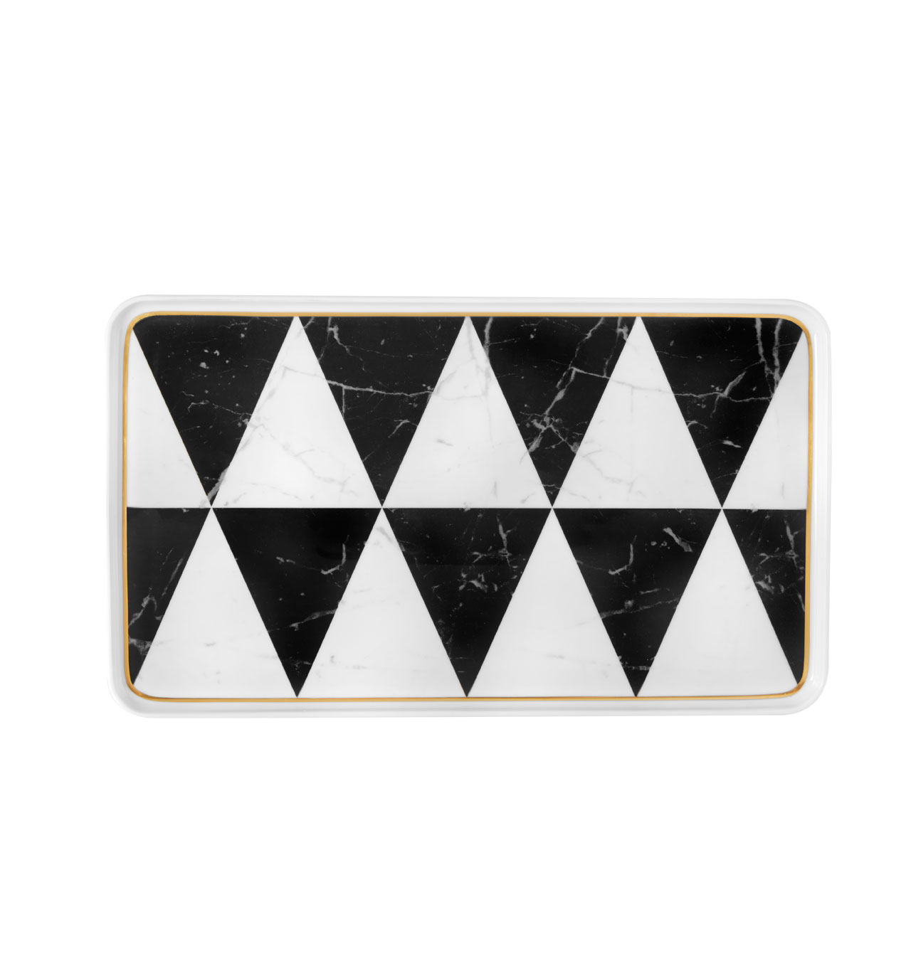 The combination between porcelain and drawings inspired by the noble marble of Carrara, a very refined, geometric approach, creates the illusion that each piece of the set is interchangeable.