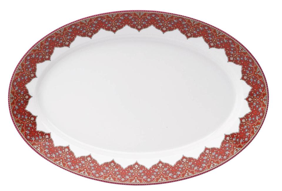 Inspired by magnificent Persian motifs, Deshoulières' ornate Dhara oval platter reinterprets delicate filigrees found in a 17th-century poetry manuscript. Our new warm color palette features twelve shades from saffron to vermilion, with gilded accents adding a hint of shimmer. Artisans handcraft the collection from premium Limoges porcelain at the workshops of Deshoulières, makers of fine dinnerware since 1826.