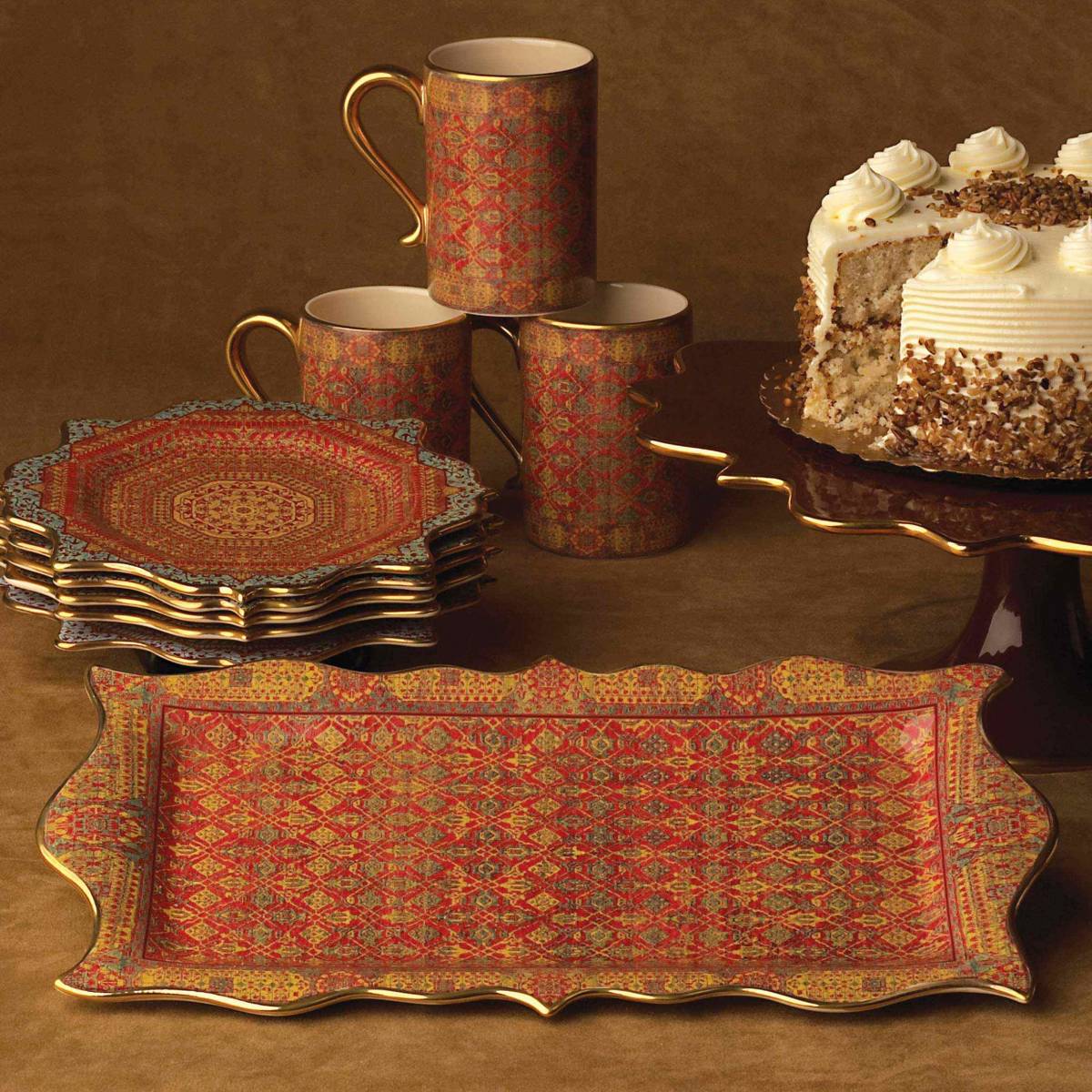 Produced in one of the world’s oldest weaving centers, Tabriz textiles are a marvel of color and technique. The artistry of the L'Objet Tabriz collection recalls a stroll through an old world marketplace, with each piece offering a rich tapestry of texture and hues. Made of earthenware with hand-gilded 24K gold accents.