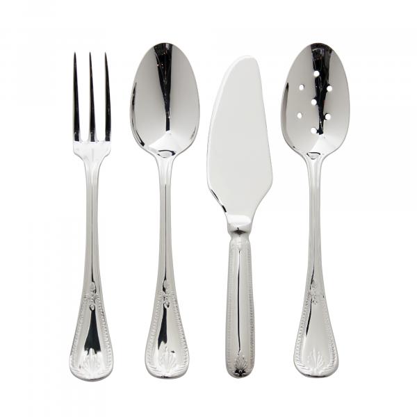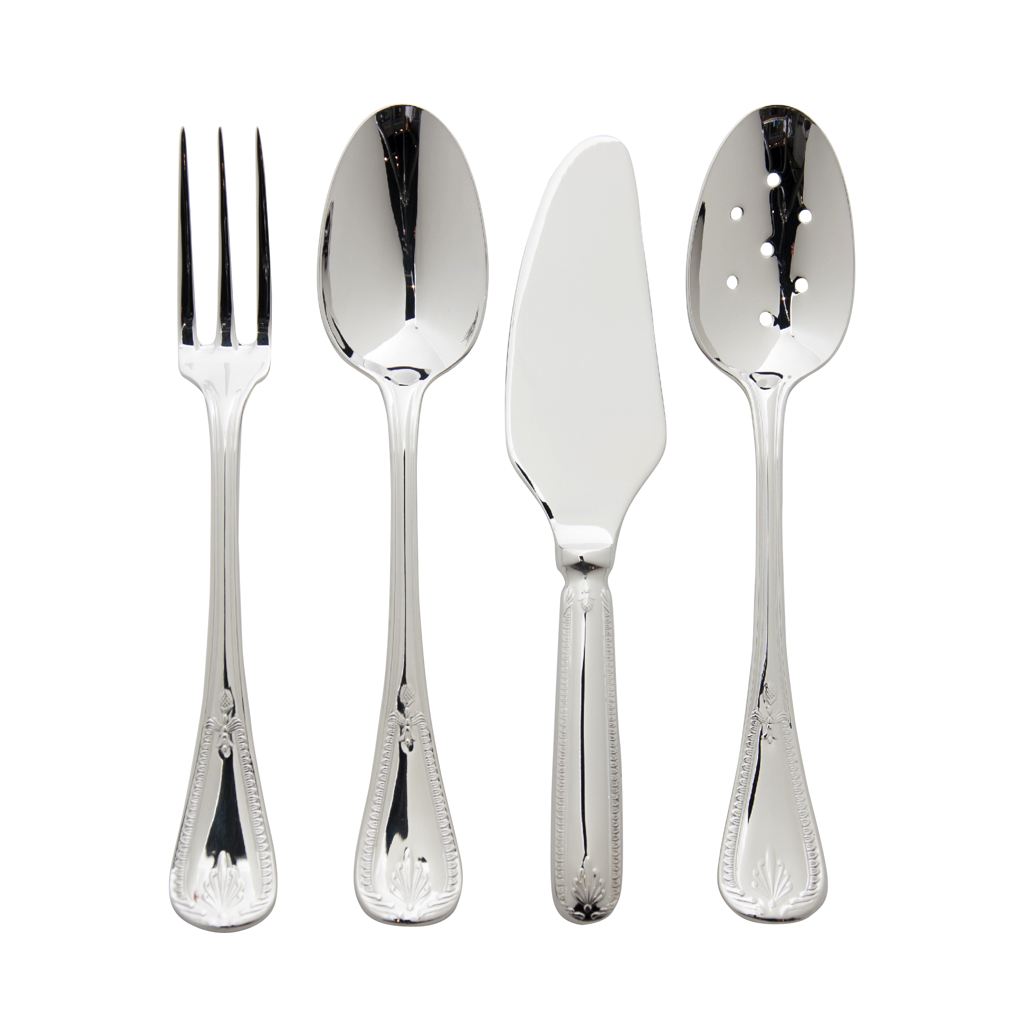 Includes 1 serving fork, 1 serving spoon, 1 cake server, and 1 pierced serving spoon