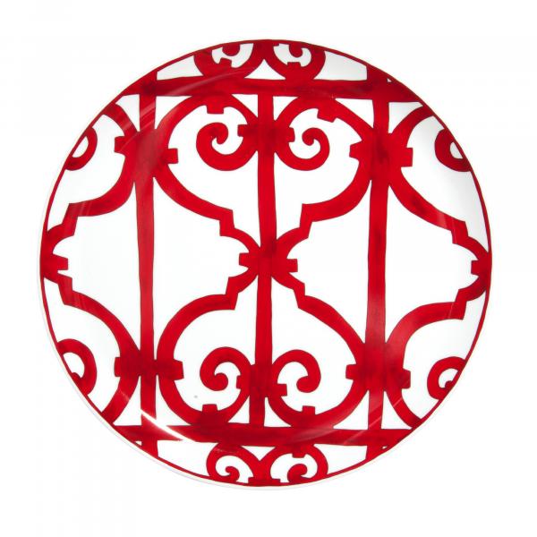 Graphic and bold, the scenery recalls the ironwork of Andalusian towns. The sturdiness of the drawing, the vitality of the red and the wealth and variety of the pieces make it a noble table service.