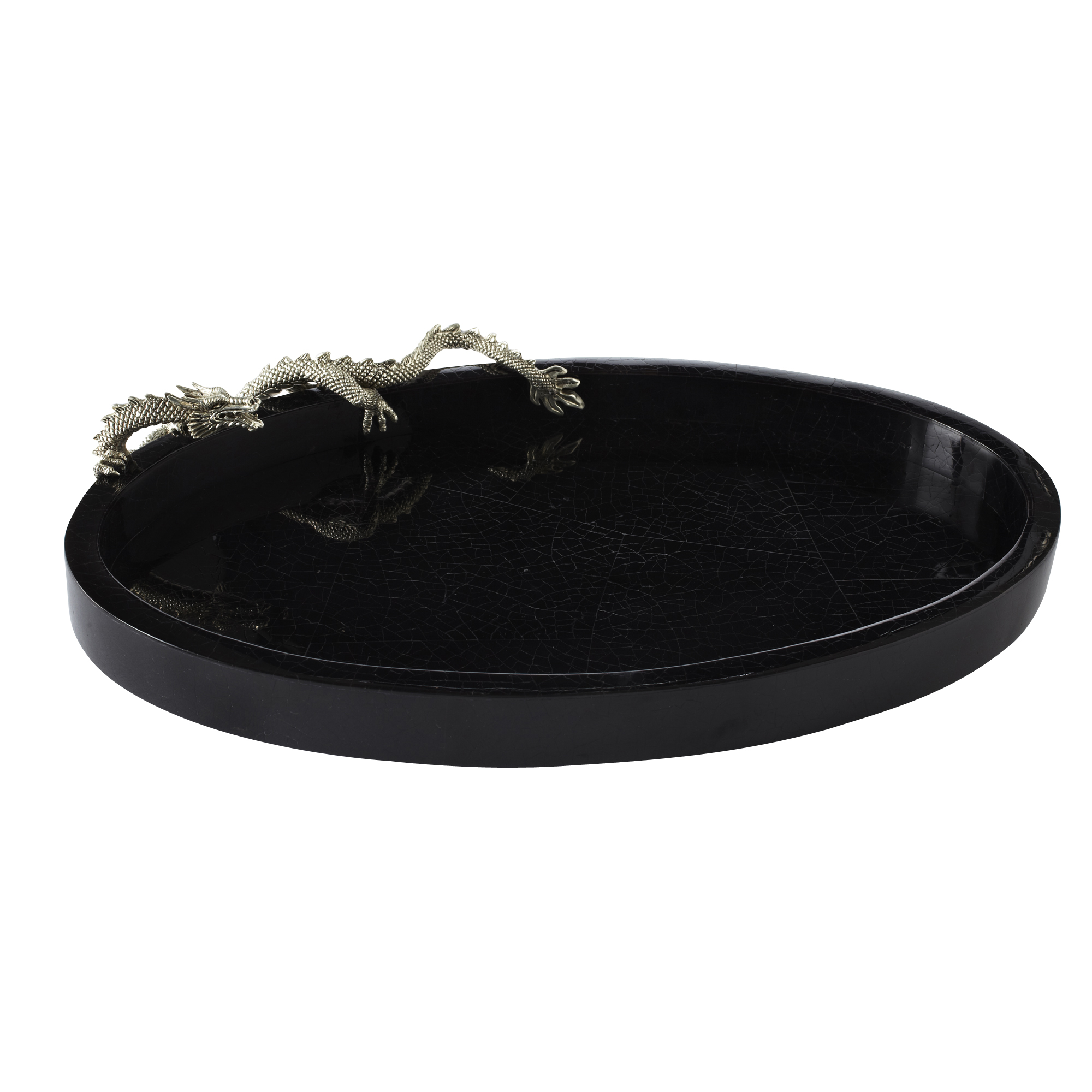 A sinewy dragon curves around this classic oval tray made of black pen shell. Not only will this tray bring cultural elegance to your home but is also an ideal way to display and serve appetizers, finger foods, and entrees.