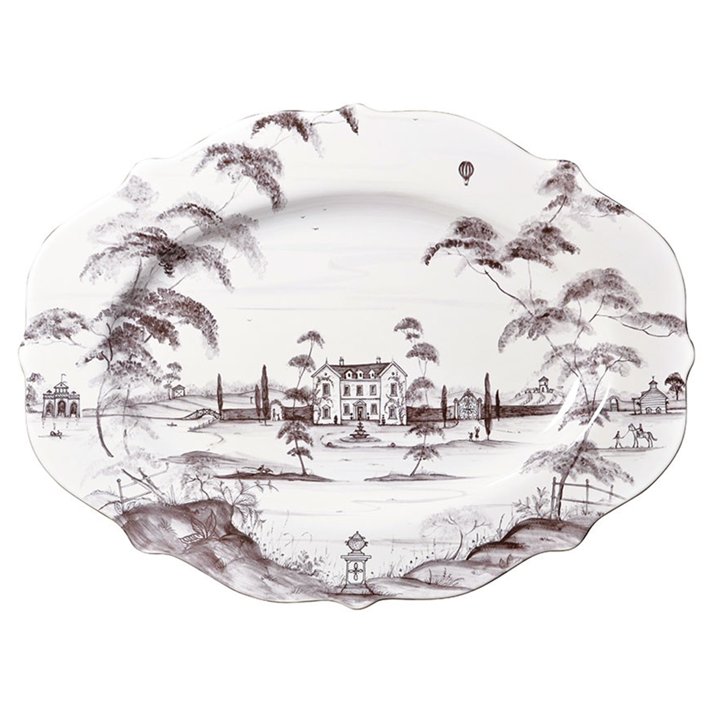From our Country Estate Collection- This stately show-stopper conveys the virtues of home and hospitality. Use it to proudly display your culinary adventures, from the casual Friday night chicken for two, to your famous Christmas roast for ten. Featuring: Main House, Stable, Boathouse, and Hot Air Balloon. Our ceramic stoneware is made in Portugal and is oven, microwave, dishwasher and freezer safe.