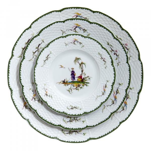 Inspired by the Rococo painter Jean Pillement, the striking dinnerware depicts Chinese country scenes from the eighteenth century. Add this joyfully nostalgic piece to your elegant table.