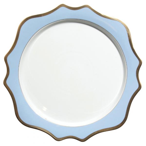 With a lovely sky blue border and a gold band, this collection will add a striking element of design and color to a well-set table. Pair with more lavish pieces from Anna’s assortment, or more simple accessories for an understated elegance.