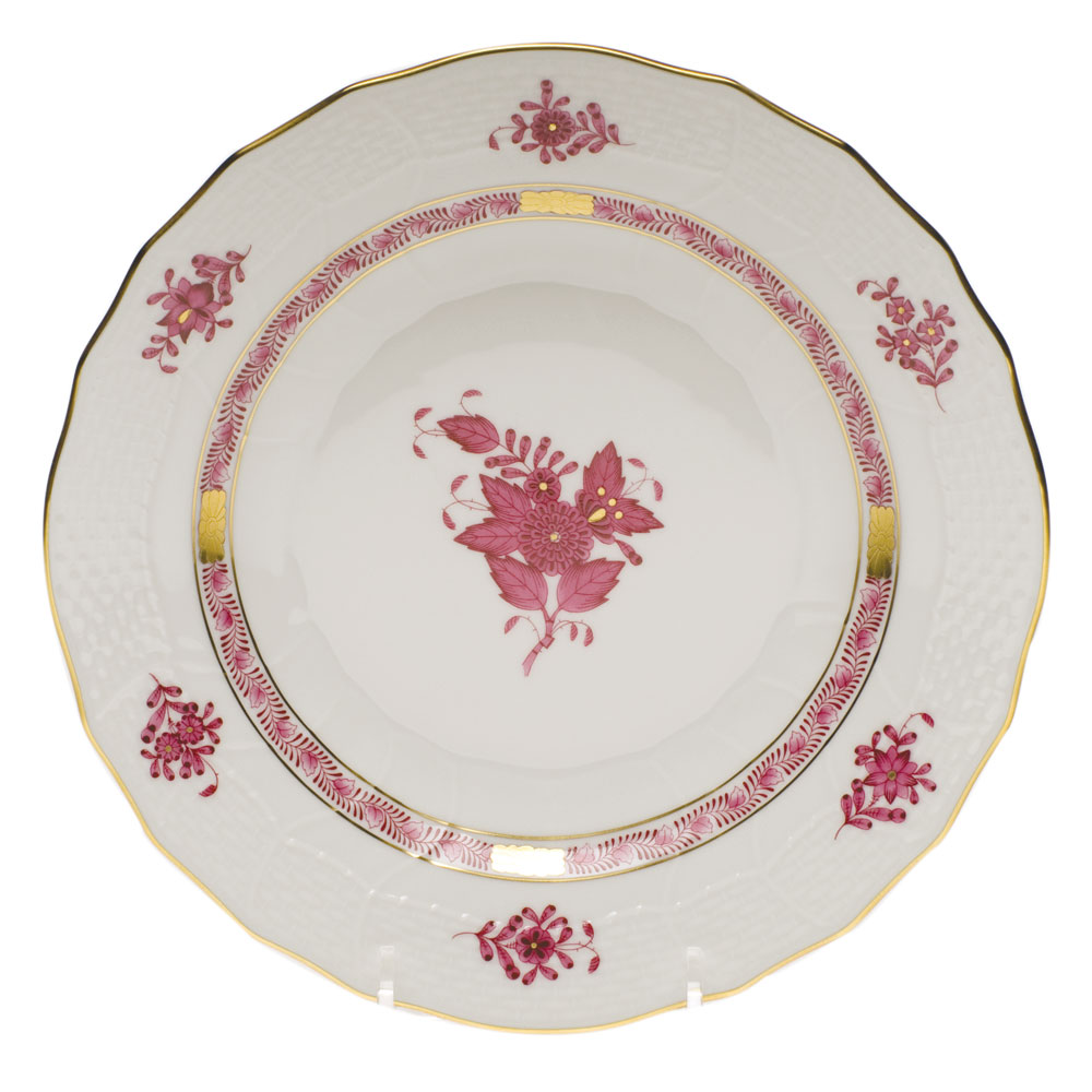 Originally created in 1930 in raspberry coloration for Count Albert Apponyi, the pattern features a center motif of a stylized peony surrounded by a garland of leaves with 24K gold rosettes.