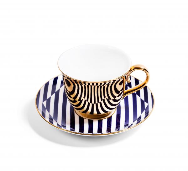 The Reflect collection brings life back to antique saucers, missing their other halves, by using platinum and gold gilding to create highly reflective cups. The mirrored cups reflect the patterned saucers, uniting them as perfect couples. Here you are purchasing an individual cup without a saucer.