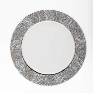 When it comes to your design in china, you might love a repeating pattern in a soft grey color or other neutral with a metallic charger plate. Pair your china with a patina linen in white, gunmetal, and silver and a luster placemat in granite. Choose crystal glassware with an interesting stem or modern design.