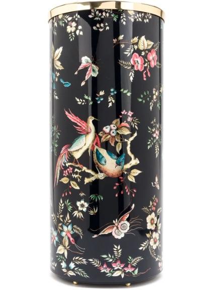 Black Coromandel umbrella stand from Fornasetti featuring a round body, a metal construction and a printed design. This item is unisex.