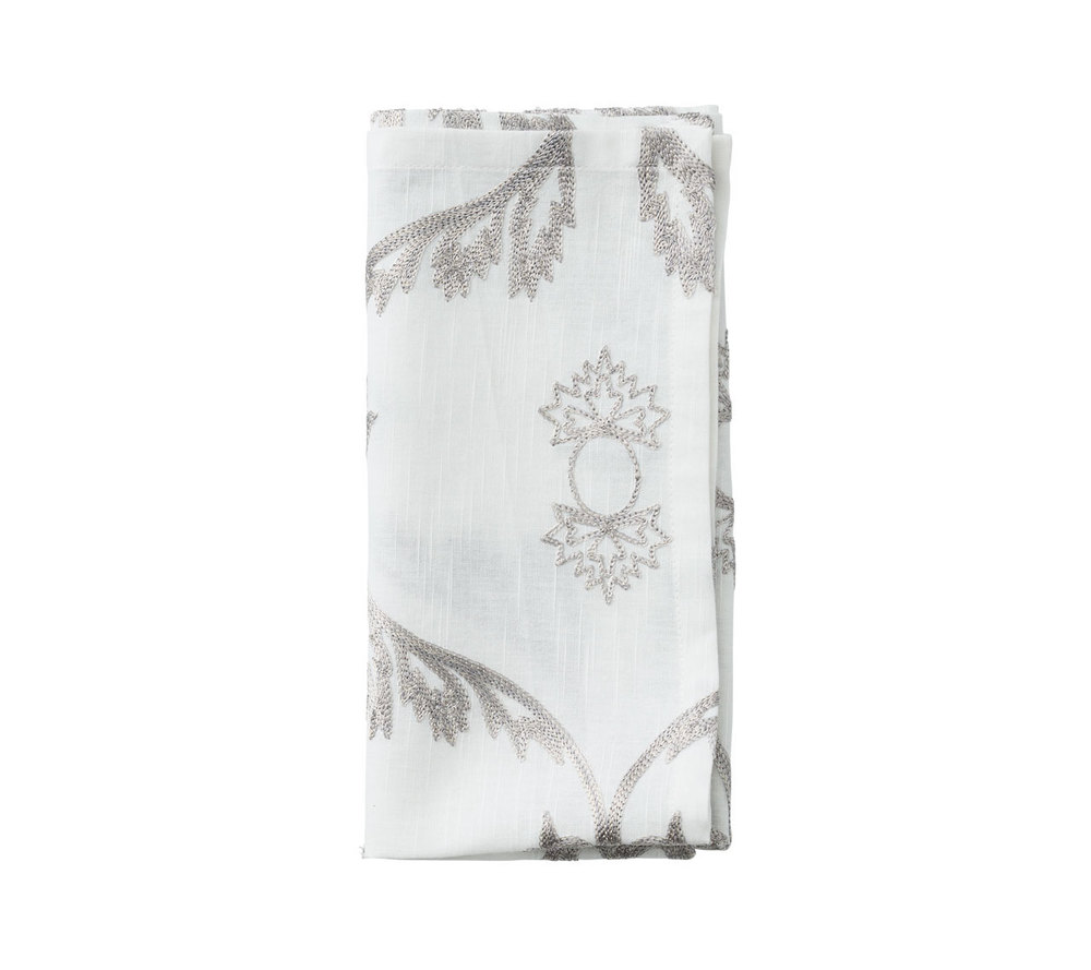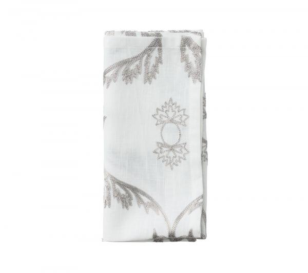 A vintage Suzani fabric was the inspiration for this napkin. It has a white cotton base and is embroidered in tonal threads to create depth and illusion.