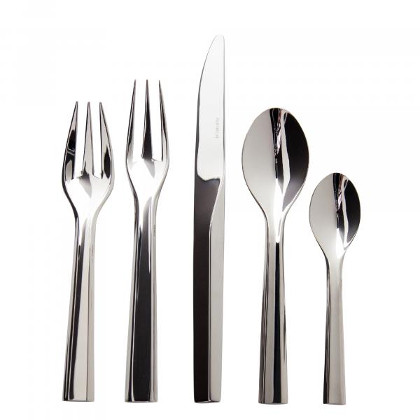 Sharp edges, elongated lines and surfaces polished to a mirror finish make this stainless steel cutlery a force to be reckoned with. Fruit of a collaboration with Patrick Jouin in 2010, this collection is the designer’s first set of cutlery. Already hailed as a classic, Zermatt is exhibited at the Centre Pompidou Museum in Paris and in New York’s Museum of Arts and Design. This line is also available upon request in a "gold immersion" finish, in which each piece is immersed in a 24-carat gold bath.